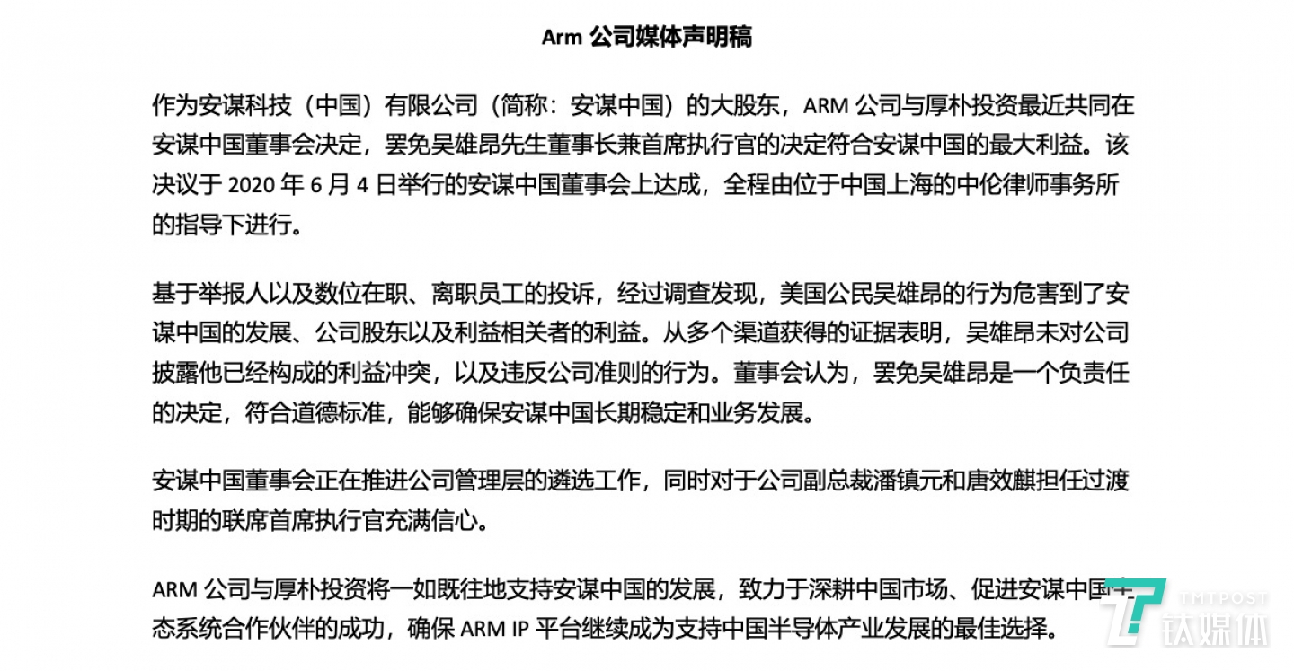 6月11日,再次被安謀中國否認(rèn)罷免CEO后,Arm方面和厚樸投資聯(lián)合發(fā)表媒體聲明,公開了這次董事會決議。Arm及厚樸稱,基于舉報人以及數(shù)位在職、離職員工的投訴,吳雄昂未對公司披露他已經(jīng)構(gòu)成的利益沖突,以及違反公司準(zhǔn)則的行為,因此將吳雄昂罷免,“吳雄昂的行為危害到了安謀中國的發(fā)展、公司股東,以及利益相關(guān)者的利益”。