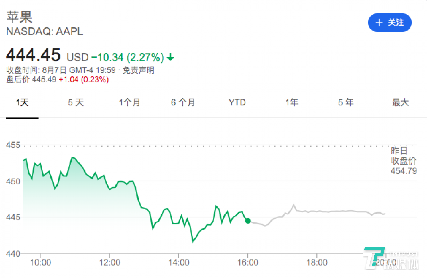 截至美東時間8月7日收盤,美股科技股普跌,蘋果股價報444.45美元/股,跌超2%。