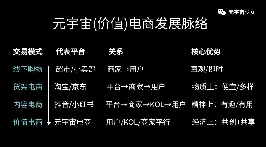 接下來的元宇宙電商即價(jià)值電商,平臺(tái)將被互聯(lián)互通的元宇宙取代,用戶、KOL跟商家可以任意連接——從互聯(lián)網(wǎng)到互鏈網(wǎng),最后一輪個(gè)體價(jià)值將被激活,交易關(guān)系將從上下承接到左右連接,形成一個(gè)更好的閉環(huán)增長生態(tài)。