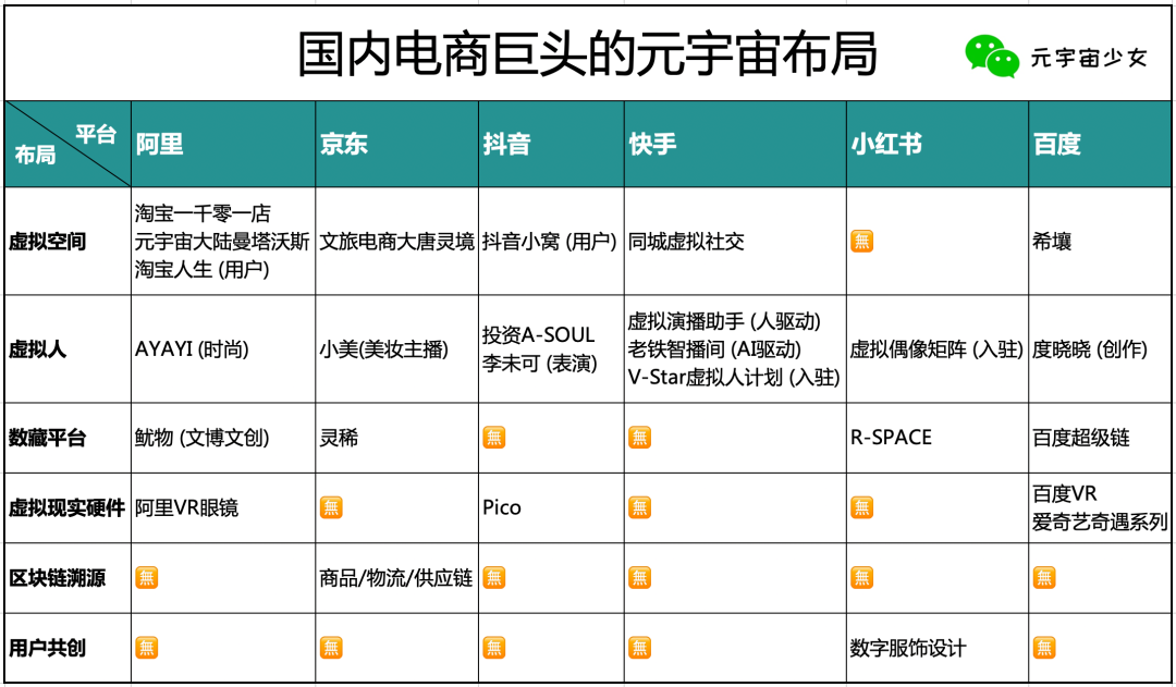 以上兩個(gè)新銳公司本質(zhì)上是用區(qū)塊鏈重塑產(chǎn)銷關(guān)系,而國內(nèi)大廠布局元宇宙電商的動(dòng)作更常規(guī)些。以營銷應(yīng)用為主的各類虛擬人最先盈利,成為一致的布局點(diǎn),其他都在摸索進(jìn)步中。