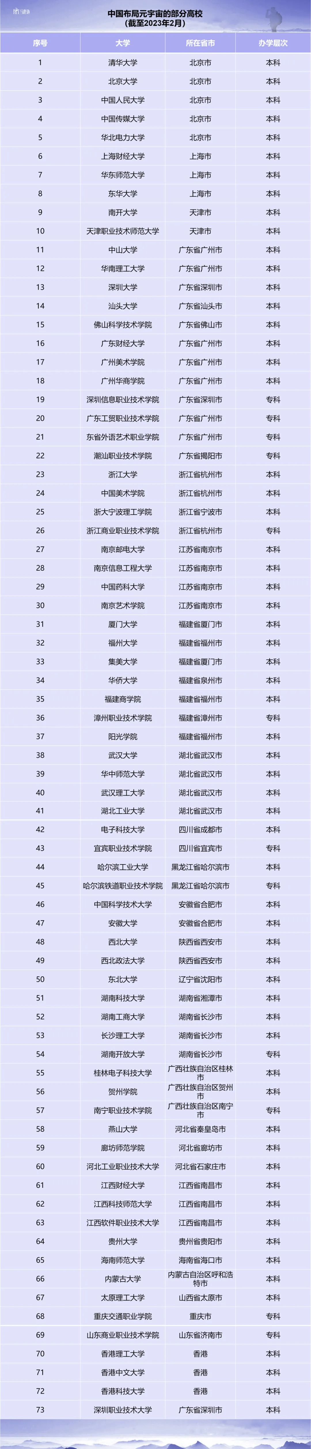 直到2023年2月,據(jù)不完全統(tǒng)計,全國已經(jīng)有至少73所高校布局元宇宙領(lǐng)域,其中本科51所,???2所。這些高校主要通過設(shè)置元宇宙專業(yè)、元宇宙系列課程、打造元宇宙平臺(元宇宙科研實驗室、元宇宙實訓(xùn)平臺、元宇宙創(chuàng)新展示平臺、元宇宙校園系統(tǒng))等布局元宇宙領(lǐng)域。