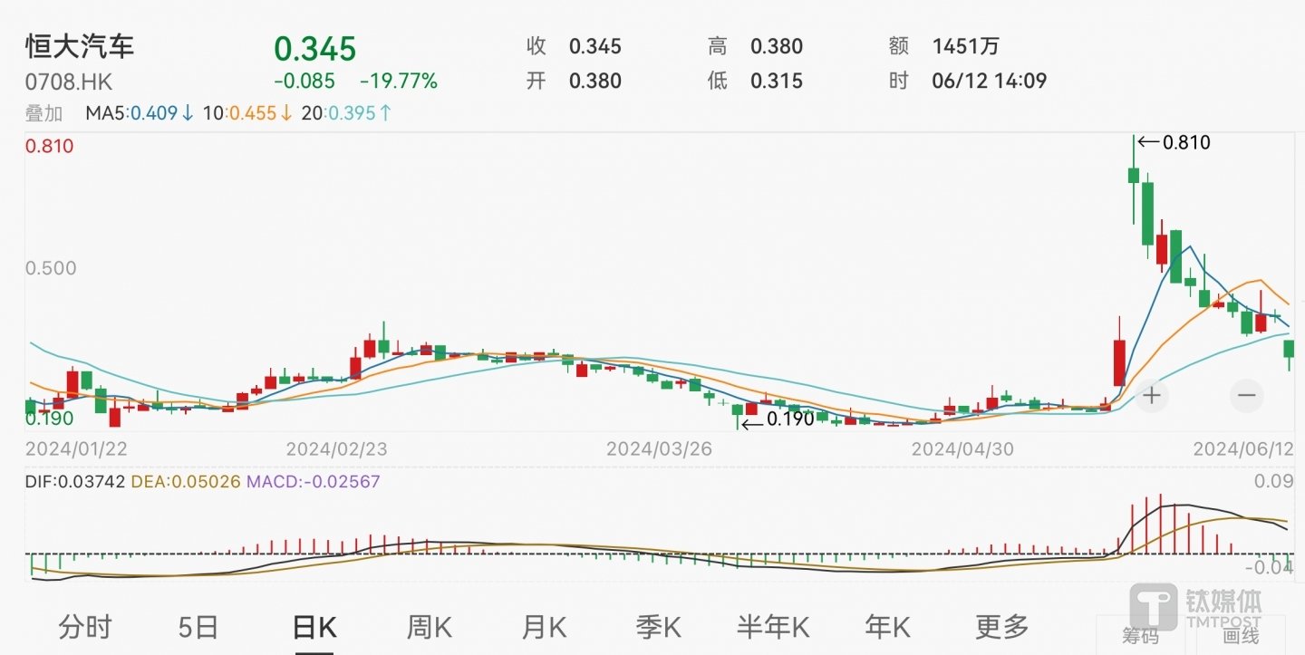 6月12日港股開盤后,恒大汽車(00708.HK)股價(jià)便大跌超20%,而后持續(xù)下滑,盤中一度跌超26%。截至發(fā)稿前,該公司股價(jià)跌19.77%,報(bào)0.345港元,總市值約37.41億港元。
