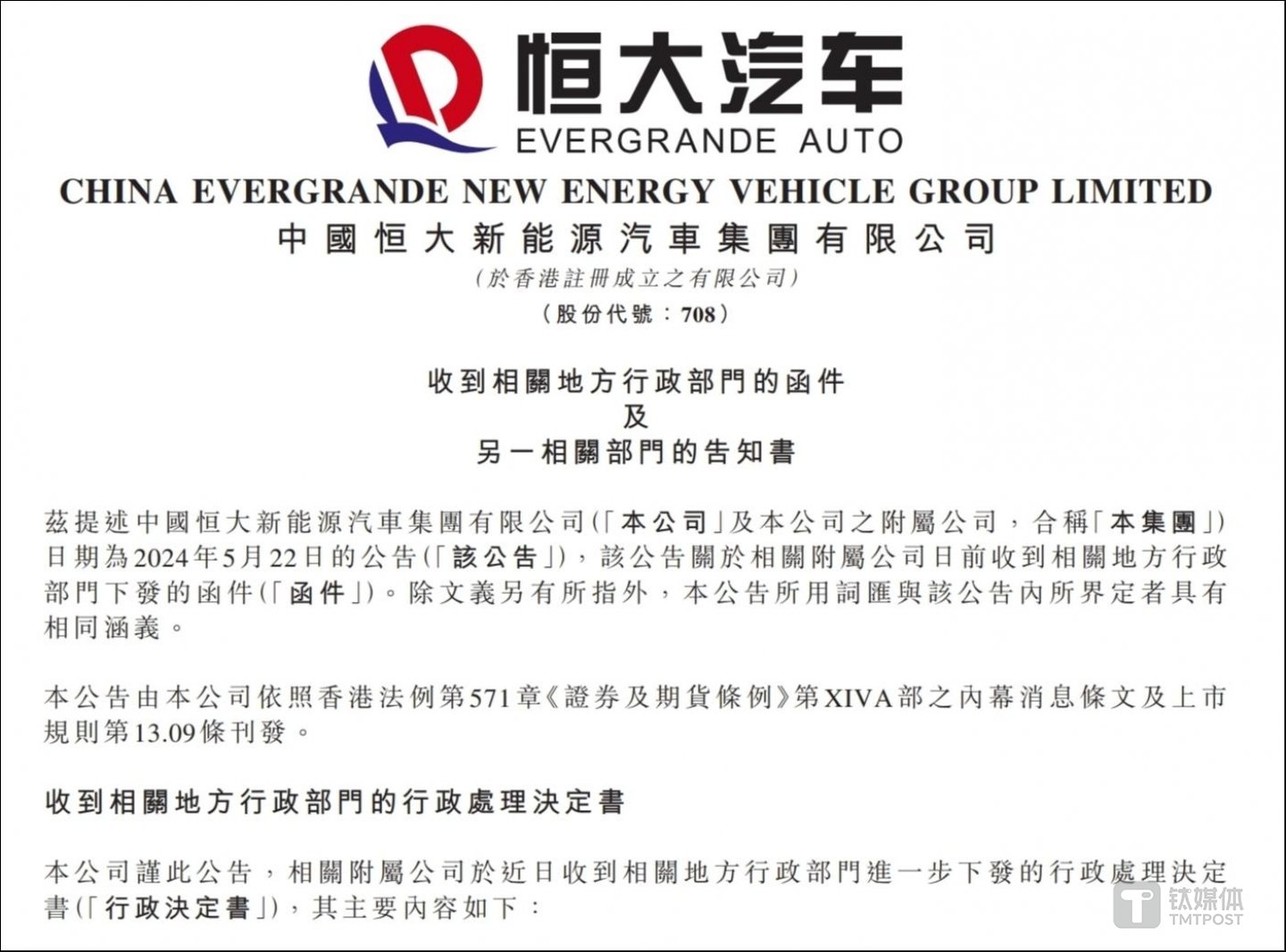 除上述行政處理決定書,恒大汽車還收到另一相關(guān)部門的告知書,主要針對公司旗下附屬公司恒大新能源汽車(天津)有限公司(下稱“天津恒大”)。