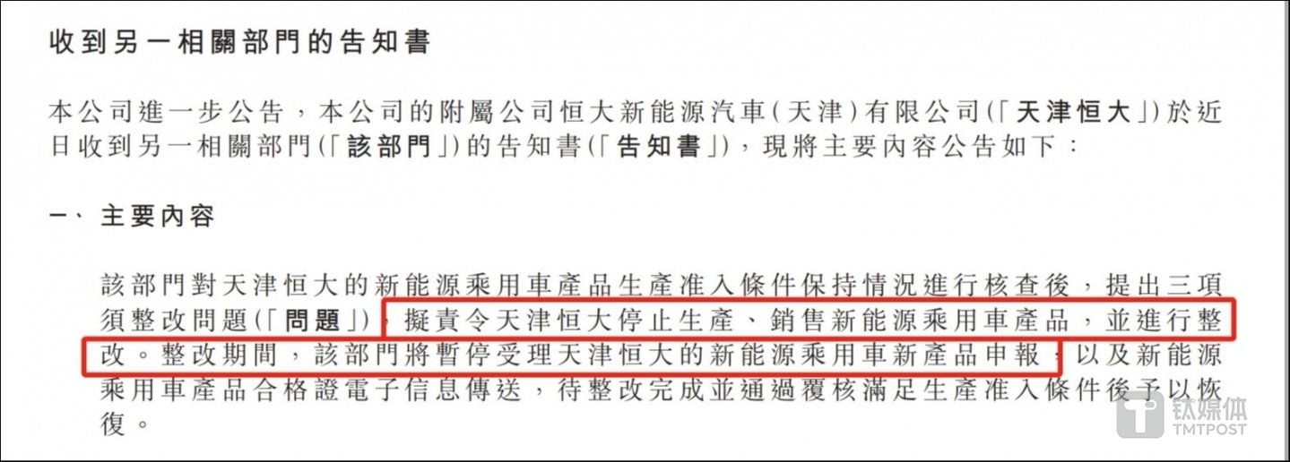 據(jù)告知書指出,該相關(guān)部門對天津恒大的新能源乘用車產(chǎn)品生產(chǎn)準(zhǔn)入條件保持情況進(jìn)行核查后,提出三項(xiàng)須整改問題:擬責(zé)令天津恒大停止生產(chǎn)、銷售新能源乘用車產(chǎn)品,并進(jìn)行整改。
