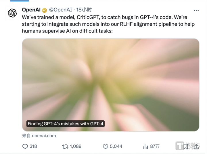 OpenAI稱,因?yàn)闆]有更好的工具,所以人們目前難以評(píng)估高級(jí)的AI系統(tǒng)的表現(xiàn)。而CriticGPT意味著,OpenAI向能夠評(píng)估高級(jí)AI系統(tǒng)輸出的目標(biāo)邁進(jìn)了一步。