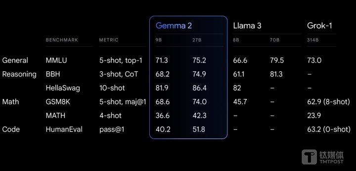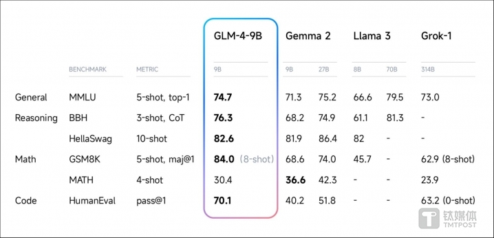 針對(duì)今晨谷歌發(fā)布的Gemma-2開源模型,6月28日中午,國(guó)內(nèi)大模型獨(dú)角獸智譜 AI 向鈦媒體App展示一份數(shù)據(jù)稱,提供的各項(xiàng)評(píng)測(cè)對(duì)比中,近1個(gè)月前發(fā)布開源的國(guó)產(chǎn)大模型 GLM-4-9B 似乎更具有優(yōu)勢(shì)。