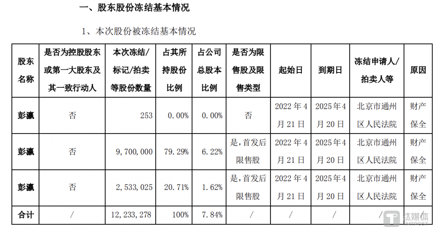 遭遇司法凍結(jié)后,彭瀛以“并非該股權(quán)轉(zhuǎn)讓協(xié)議的簽署方”為由請求人民法院解除保全裁定。隨后該部分股份于2022年5月10日被解凍,3天后,彭瀛所持的154.55萬股股份再度被法院凍結(jié)。在當(dāng)年7月份,彭瀛股份所持281.13股股份第三次被凍結(jié)。