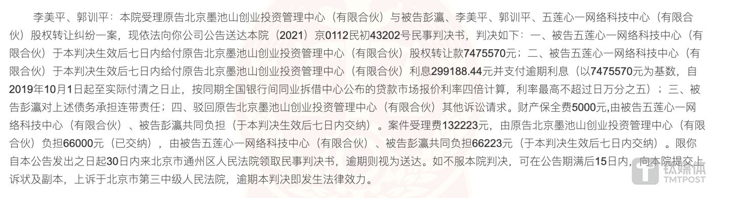 2023年5月21日,法院對彭瀛與北京墨池山之間的股權(quán)轉(zhuǎn)讓糾紛一案作出一審判決,法院要求五蓮心一向北京墨池山支付股權(quán)轉(zhuǎn)讓款以及逾期利息,彭瀛對上述債務(wù)承擔(dān)連帶責(zé)任。
