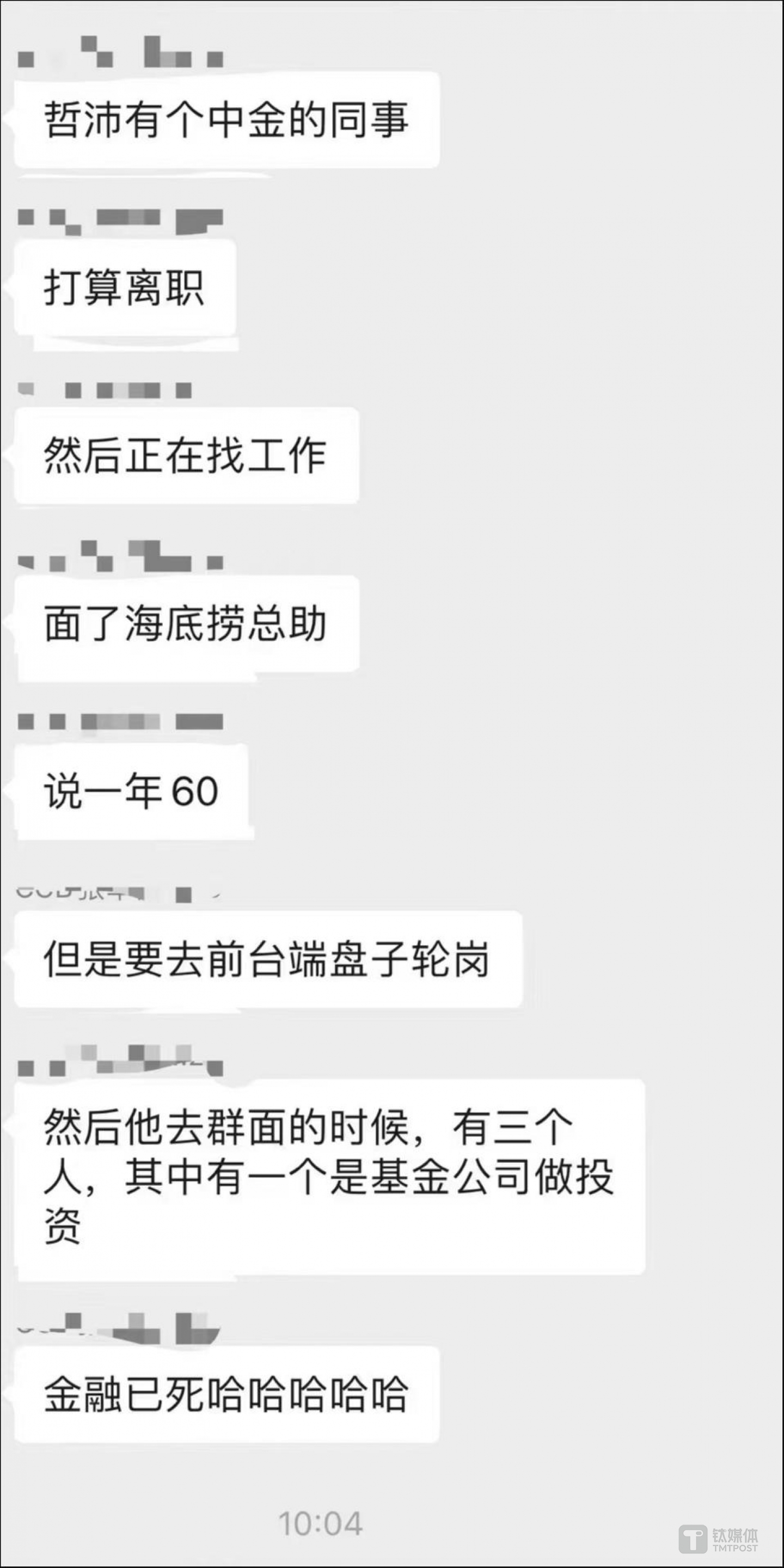 第三類是跨行就業(yè)的金融人。如果說前兩類的金融人還是在“恰飯”金融,那么這類金融人與金融圈離得就相對(duì)更遠(yuǎn)一點(diǎn)了,比如,金融人到健身房當(dāng)教練,金融人到海底撈端盤子等等。