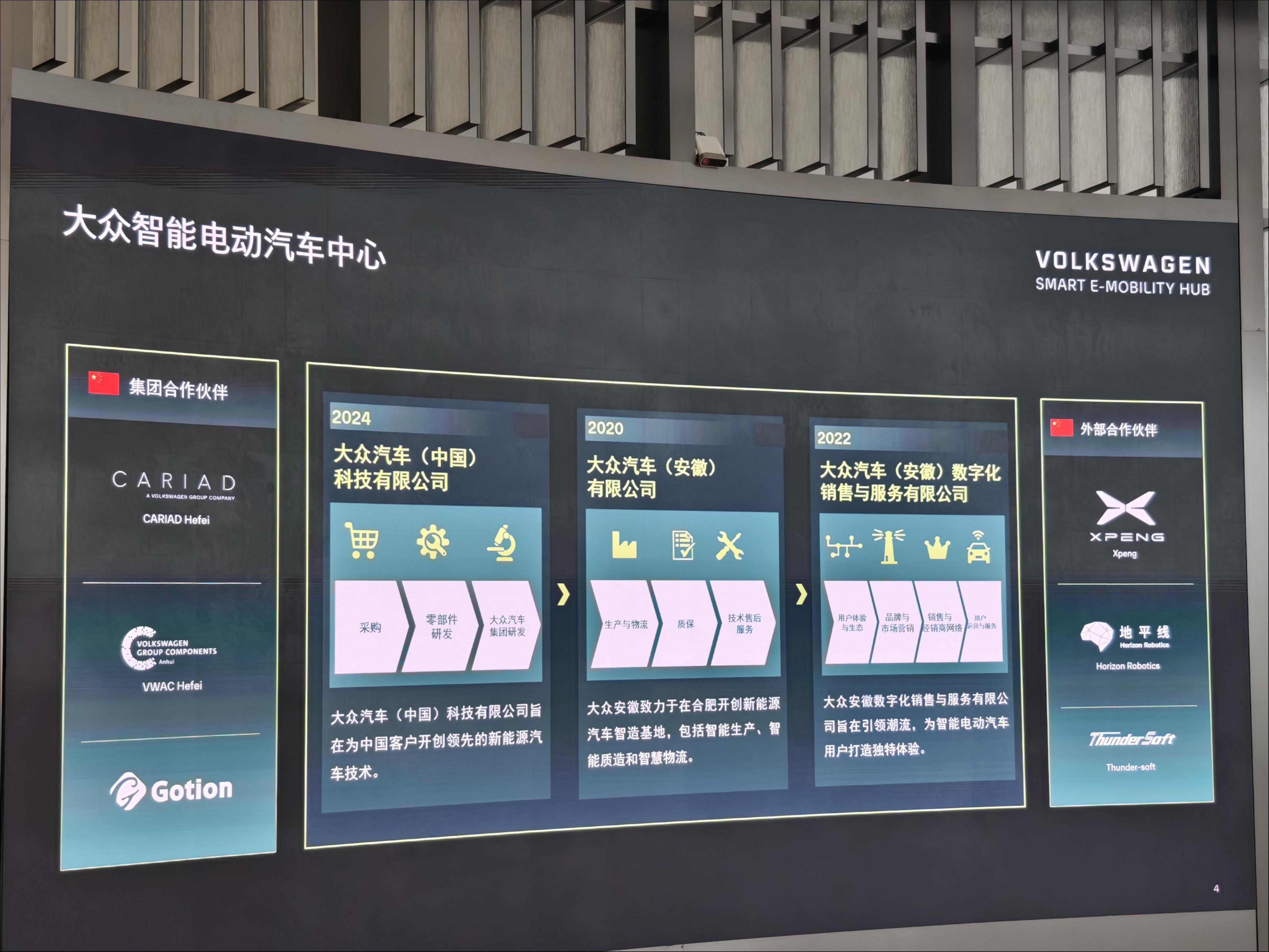 基于“在中國(guó),為中國(guó)”戰(zhàn)略,大眾在合肥成立了大眾智能電動(dòng)汽車中心,構(gòu)建了覆蓋汽車研發(fā)、生產(chǎn)、銷售和服務(wù)的完整價(jià)值鏈。此外,合肥生態(tài)還包含了CARIAD中國(guó)、大眾汽車(安徽)零部件有限公司、國(guó)軒高科等集團(tuán)內(nèi)部合作伙伴,以及地平線、中科創(chuàng)達(dá)等外部合作伙伴。