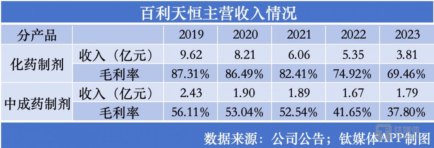 無獨有偶,原本體量偏小的中成藥制劑板塊,收入則從2019年的2.43億元降至2023年的1.79億元,毛利率更從56.11%降至37.80%。