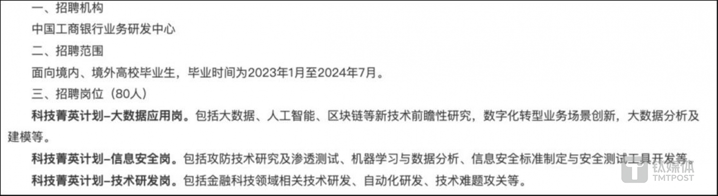 科技人員擴(kuò)張之路并未停止。比如,上半年,工行業(yè)務(wù)研發(fā)中心發(fā)布2024年度春季校園招聘公告,公告顯示該行科技菁英計劃就大數(shù)據(jù)應(yīng)用崗、信息安全崗、技術(shù)研發(fā)崗招聘80人,其中大數(shù)據(jù)應(yīng)用崗包括大數(shù)據(jù)、人工智能、區(qū)塊鏈等新技術(shù)前瞻性研究,數(shù)字化轉(zhuǎn)型業(yè)務(wù)場景創(chuàng)新,大數(shù)據(jù)分析及建模等;信息安全崗包括攻防技術(shù)研究及滲透測試、機(jī)器學(xué)習(xí)與數(shù)據(jù)分析、信息安全標(biāo)準(zhǔn)制定與安全測試工具開發(fā)等;技術(shù)研發(fā)崗包括金融科技領(lǐng)域相關(guān)技術(shù)研發(fā)、自動化研發(fā)、技術(shù)難題攻關(guān)等。
