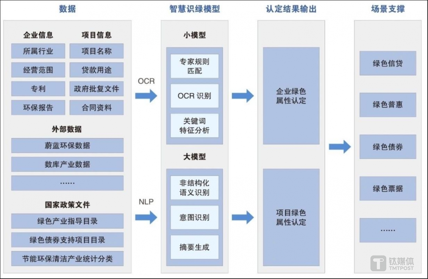 在綠色金融方面,如何判斷一個項目或企業(yè)的綠色屬性是發(fā)展綠色金融的難點之一,對此,工行利用其數(shù)字技術(shù)構(gòu)建了“智慧識綠”體系,該體系應(yīng)用該企業(yè)或項目的內(nèi)外部數(shù)據(jù),如企業(yè)或項目的信息、所屬行業(yè)、環(huán)保報告、貸款用途等內(nèi)部信息,融合如蔚藍(lán)環(huán)保數(shù)據(jù)、數(shù)庫產(chǎn)業(yè)數(shù)據(jù)等外部信息及綠色產(chǎn)業(yè)指導(dǎo)目錄等國家政策文件,通過OCR、NLP等技術(shù)構(gòu)建智慧識綠小模型、大模型來判斷綠色企業(yè)或項目等認(rèn)定,并將認(rèn)定結(jié)果應(yīng)用于綠色信貸、綠色債券等多個綠色金融場景。