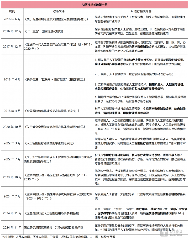 政策面來看,自 2016 年起,我國就開始出臺政策,以促進人工智能技術在醫(yī)療領域的應用,旨在從宏觀層面推動醫(yī)療行業(yè)的智能化轉型。2024年以來,隨著AI技術快速發(fā)展,相關政策逐步細化,應用場景愈發(fā)明確。