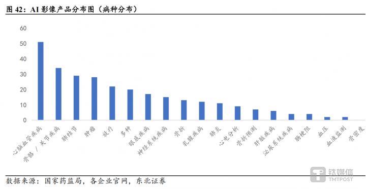 病種方面,心腦血管、骨關節(jié)、肺結節(jié)、腫瘤(放療)和眼底是目前市場上最熱門的領域,同類產(chǎn)品超過15種。相比之下,腸息肉、泌尿相關疾病的產(chǎn)品較少,細分市場相對冷門。