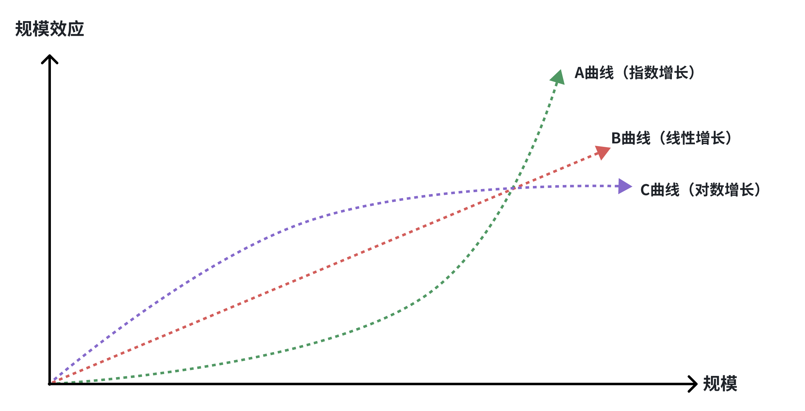 規(guī)模效應(yīng)有3種情況,一種是指數(shù)增長(zhǎng)曲線(xiàn)(圖中A),一種是線(xiàn)性增長(zhǎng)曲線(xiàn)(圖中B),一種是對(duì)數(shù)增長(zhǎng)曲線(xiàn)(圖中C),不同的曲線(xiàn)也代表著不同的競(jìng)爭(zhēng)態(tài)勢(shì),進(jìn)一步也影響著行業(yè)的終局。