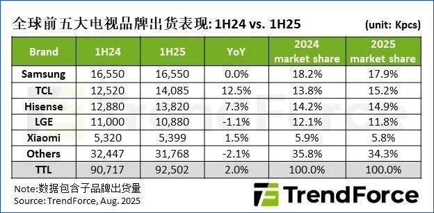 結(jié)合多家市場(chǎng)調(diào)研機(jī)構(gòu)的數(shù)據(jù)來看,上半年全球電視出貨量在9080萬臺(tái)至9250萬臺(tái)之間,同比下降1.5%或微增2%(由于統(tǒng)計(jì)口徑不同所致)。雖然數(shù)據(jù)存在一定差異,但并未影響對(duì)市場(chǎng)整體趨勢(shì)的判斷,基于對(duì)下半年市場(chǎng)環(huán)境的評(píng)估,調(diào)研機(jī)構(gòu)TrendForce將2025全年電視出貨量預(yù)估調(diào)整為1.95億臺(tái),同比減少1.1%。