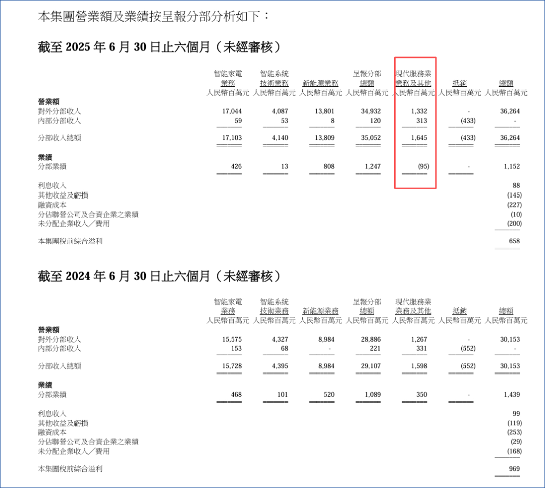 現(xiàn)代服務(wù)業(yè)及其他業(yè)務(wù)本期收入 13.3 億元,分部業(yè)績(jī)(營(yíng)業(yè)利潤(rùn))卻虧損 9500 萬元,成為本期業(yè)績(jī)的最大利潤(rùn)缺口,暴露出該業(yè)務(wù)板塊抗風(fēng)險(xiǎn)能力較弱的問題。