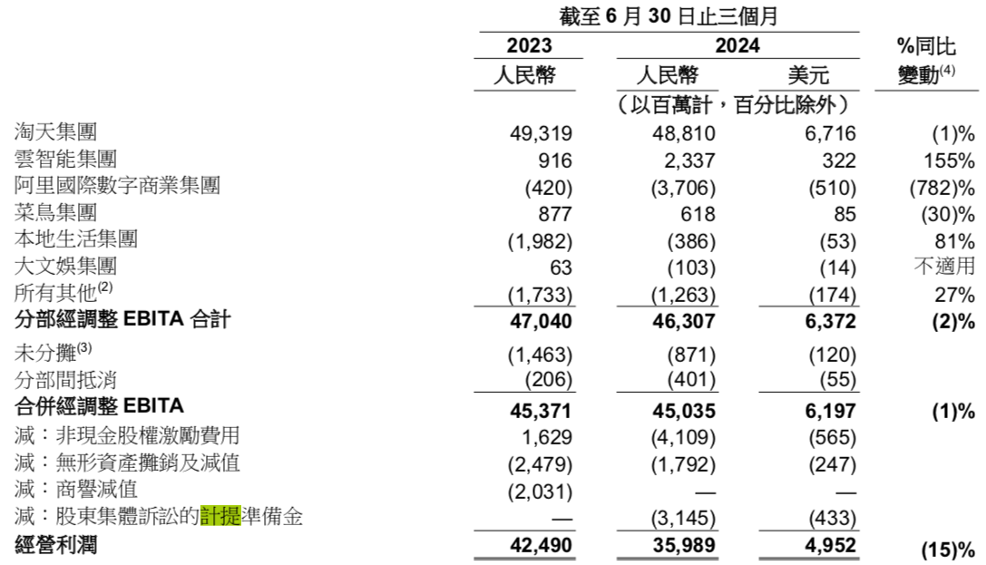 再比如,阿里巴巴在自然年2024年 6月的Q2財報中,計提了31.45億元、合4.33億美元的股東集體訴訟準備金,在經(jīng)調(diào)整EBITDA利潤明細中進行了說明。它屬于日常經(jīng)營業(yè)務之外的事項,但對經(jīng)營利潤產(chǎn)生影響。此事主要涉及與美國投資者的一項協(xié)議和解支付,阿里在財報中計提這筆費用時尚未就此付款。