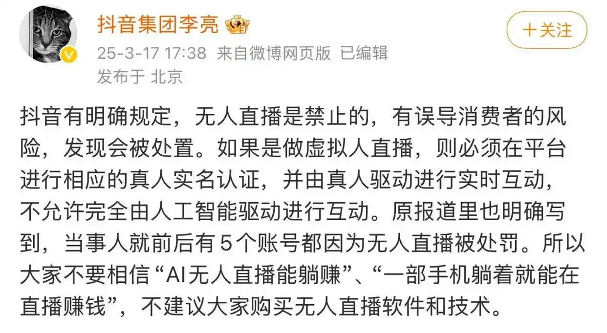 2023年、2024年,抖音多次發(fā)文倡議商家不要使用完全由AI驅(qū)動的數(shù)字人主播,并陸續(xù)進(jìn)行了多次大規(guī)模整治,封禁了一大批相關(guān)賬號。