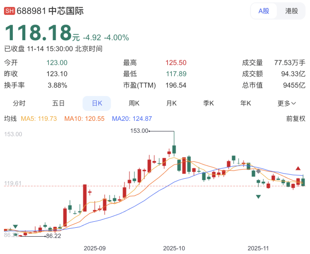 截至 11 月 14 日收盤,中芯國際當日跌幅高達 4%。
