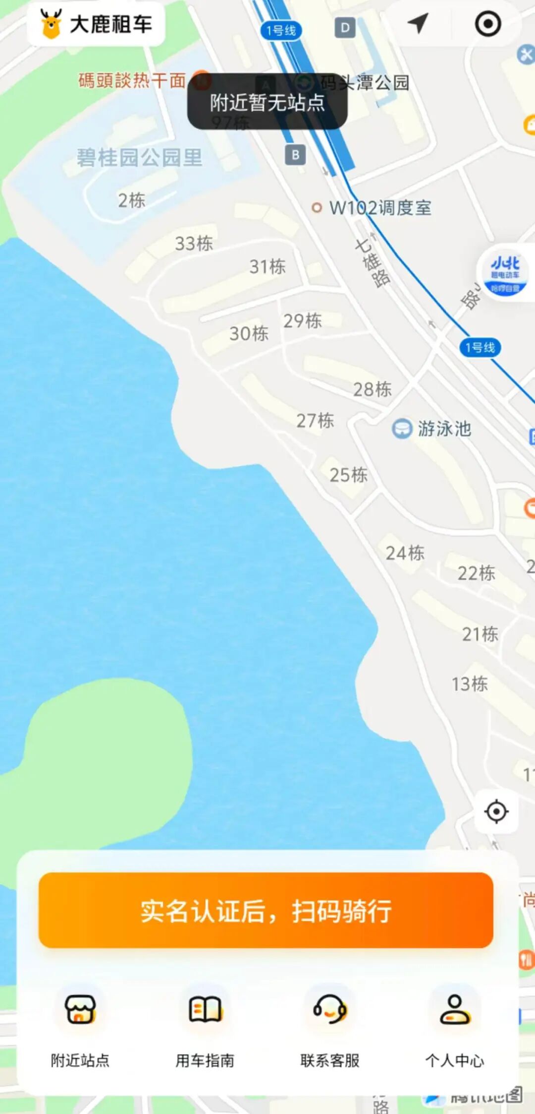 閃租則在步驟上更加便捷,到大鹿租車站點,找到立牌掃碼,并選擇租用車輛,點擊響鈴找車,通過車牌對比,找到站點的對應車輛即可騎行。歸還時,也是將車騎行到原站點的指定位置,點擊“去還車”即可。