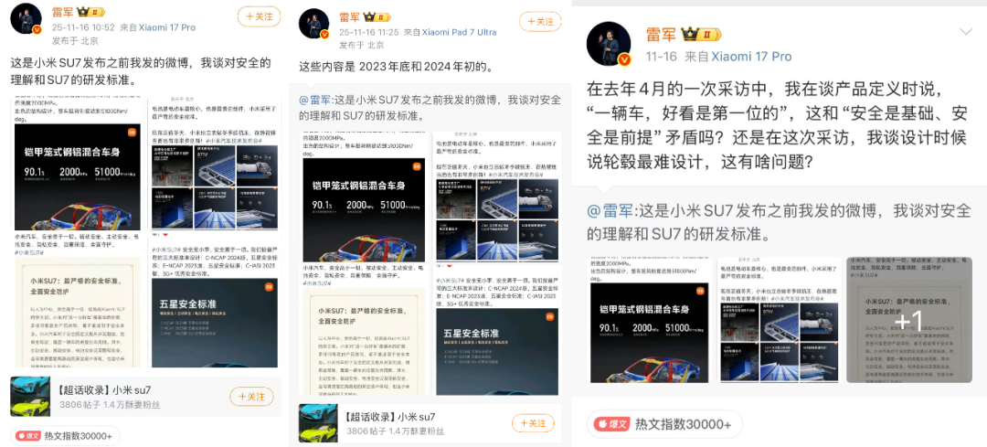 隨后,雷軍又兩次轉(zhuǎn)發(fā)了上述微博,其中一條配文,“這些內(nèi)容是2023年底和2024年初的。”證實自己在產(chǎn)品研發(fā)之時,已經(jīng)將安全作為產(chǎn)品研發(fā)的基礎(chǔ)。