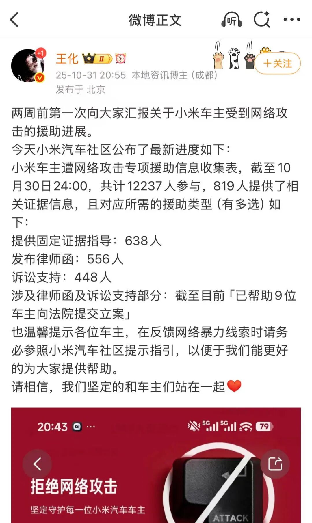 王化也對小米車主受到網(wǎng)絡(luò)攻擊的事件十分敏感,其曾在今年10月通報了小米車主受到網(wǎng)絡(luò)攻擊的進展,稱截至10月15日24:00,共計有6032人參與了小米車主遭網(wǎng)絡(luò)攻擊轉(zhuǎn)向援助的信息收集,并對應(yīng)向其中的用戶提供固定證據(jù)指導(dǎo)、發(fā)布律師函、訴訟支持三項援助。