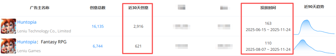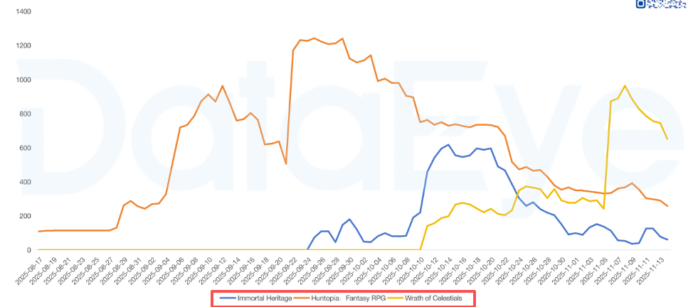 值得一說的是,《Huntopia》公測后不久,樂牛旗下還在全球多個區(qū)域市場測試了《Immortal Heritage》與《Wrath of Celestials》兩款產(chǎn)品,但后兩款游戲的投放峰值遠不如前者,成績自然也相差甚遠。