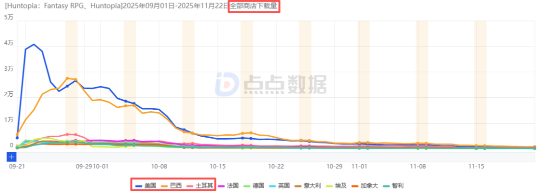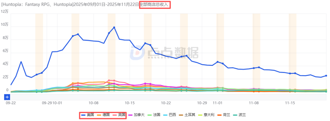 緊接著便是9月22日樂牛在全球140多個國家及地區(qū)上線的放置MMORPG新游《Huntopia:Fantasy RPG》(以下簡稱《Huntopia》),10月更是依仗該作的爆發(fā)式增長重返中國游戲廠商出海收入TOP30(位于第25)。