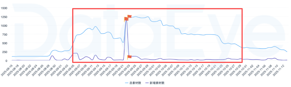 結(jié)合廣大大及DataEye數(shù)據(jù)來看,游戲谷歌端早在6月便開始素材投放,蘋果端則是8月初開始,9月中上旬雙端投放量級開始逐步拉升(當(dāng)月雙端去重后創(chuàng)意廣告超過1.8萬條,其中安卓端超1.2萬條),公測當(dāng)天達到頂峰,彼時單日投放量超1000組,約等于《寒霜啟示錄》素材投放量,但隨后開始下滑,11月時已經(jīng)落至單日300組左右。