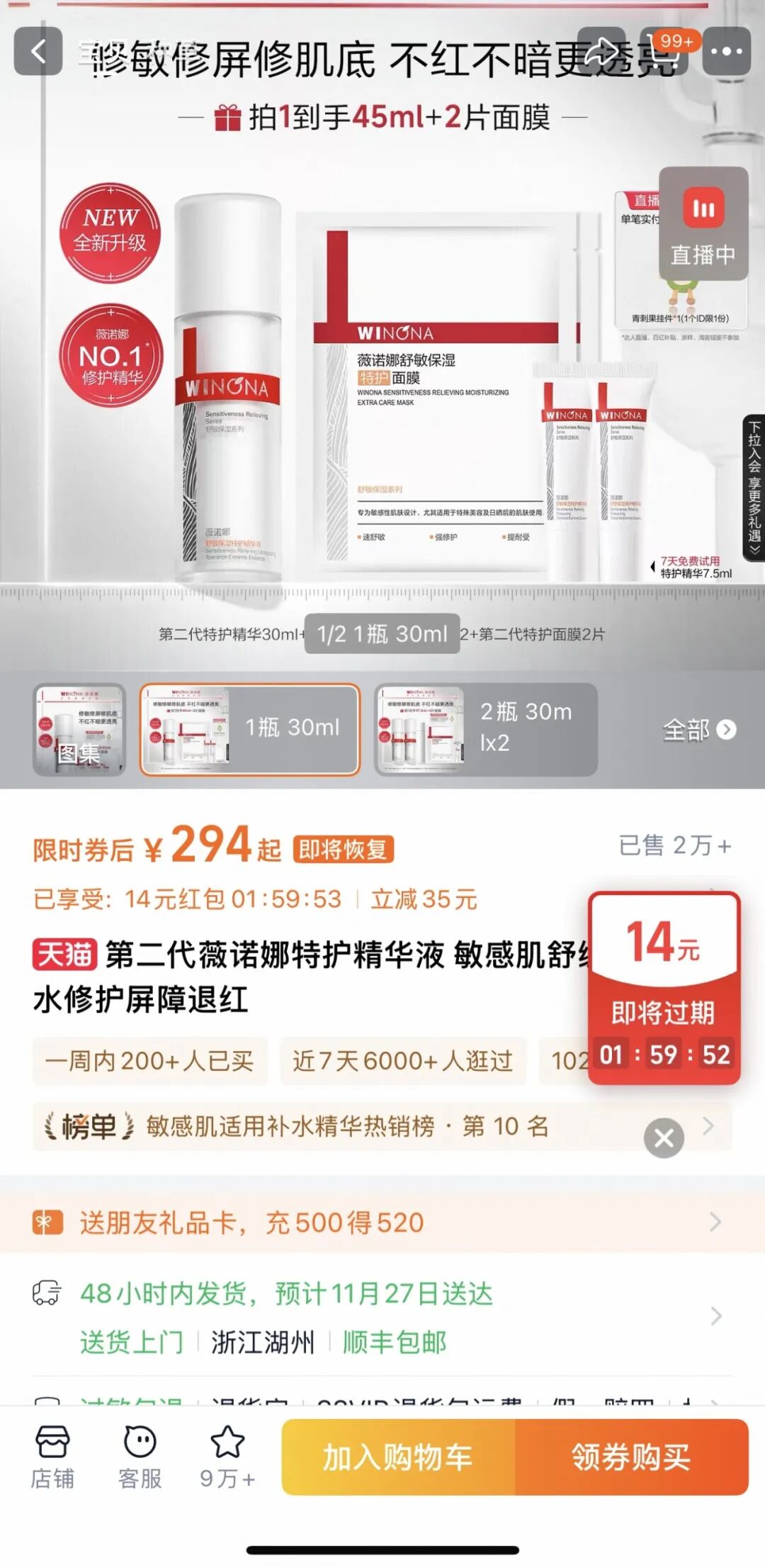 電商平臺(tái)顯示,截至11月24日,薇諾娜特護(hù)精華液現(xiàn)價(jià)294元/30ml,珀萊雅早C晚A精華組合518元/60ml,而倩碧302光子鐳射瓶價(jià)格595元/30ml,是前兩者的兩倍。