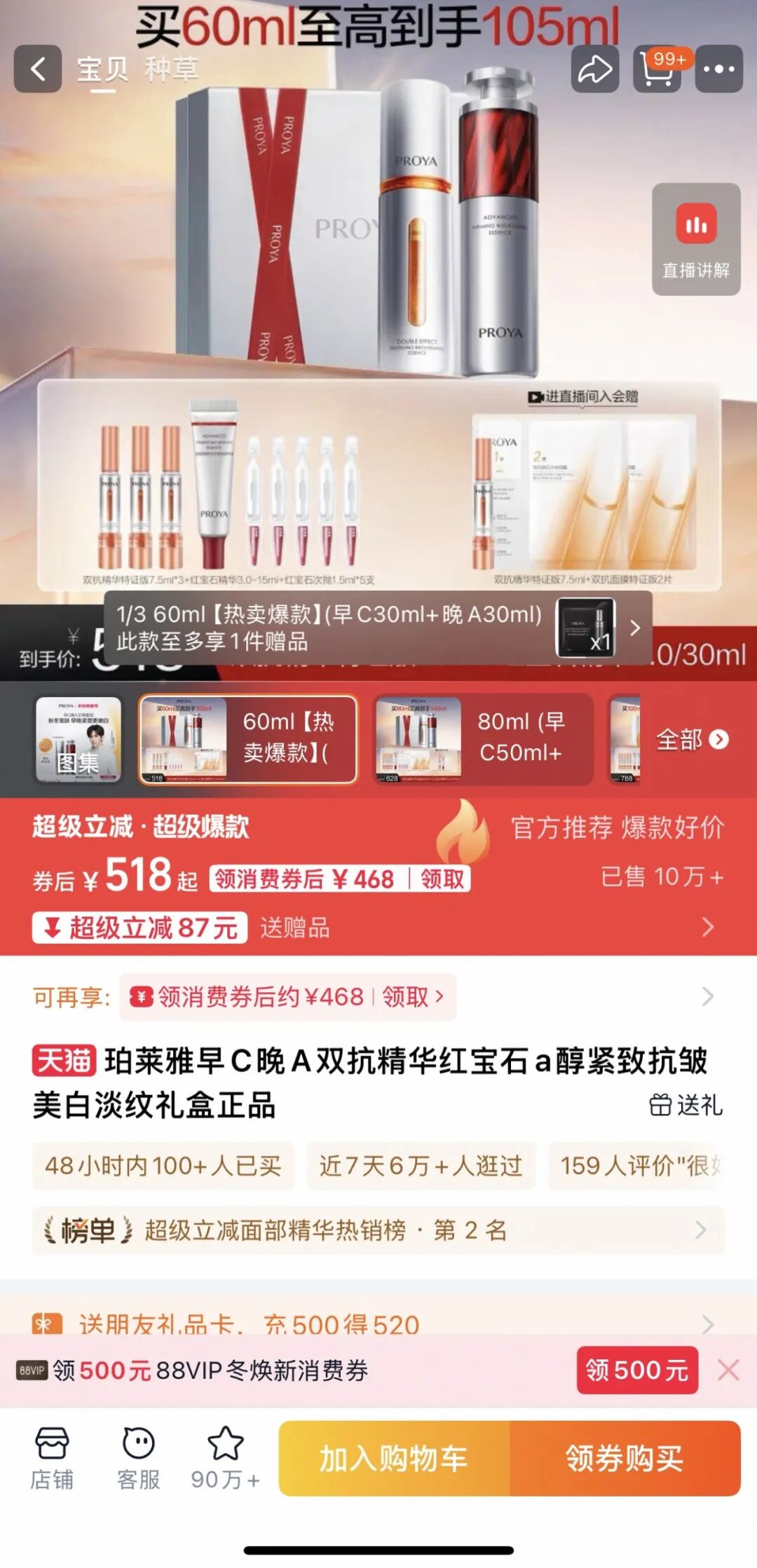 而從銷量來看,倩碧302光子鐳射銷量3萬+,只有珀萊雅早C晚A套裝的三分之一。如果以單品來對比,珀萊雅雙抗精華銷量更是達(dá)到30萬+,是倩碧的10倍。