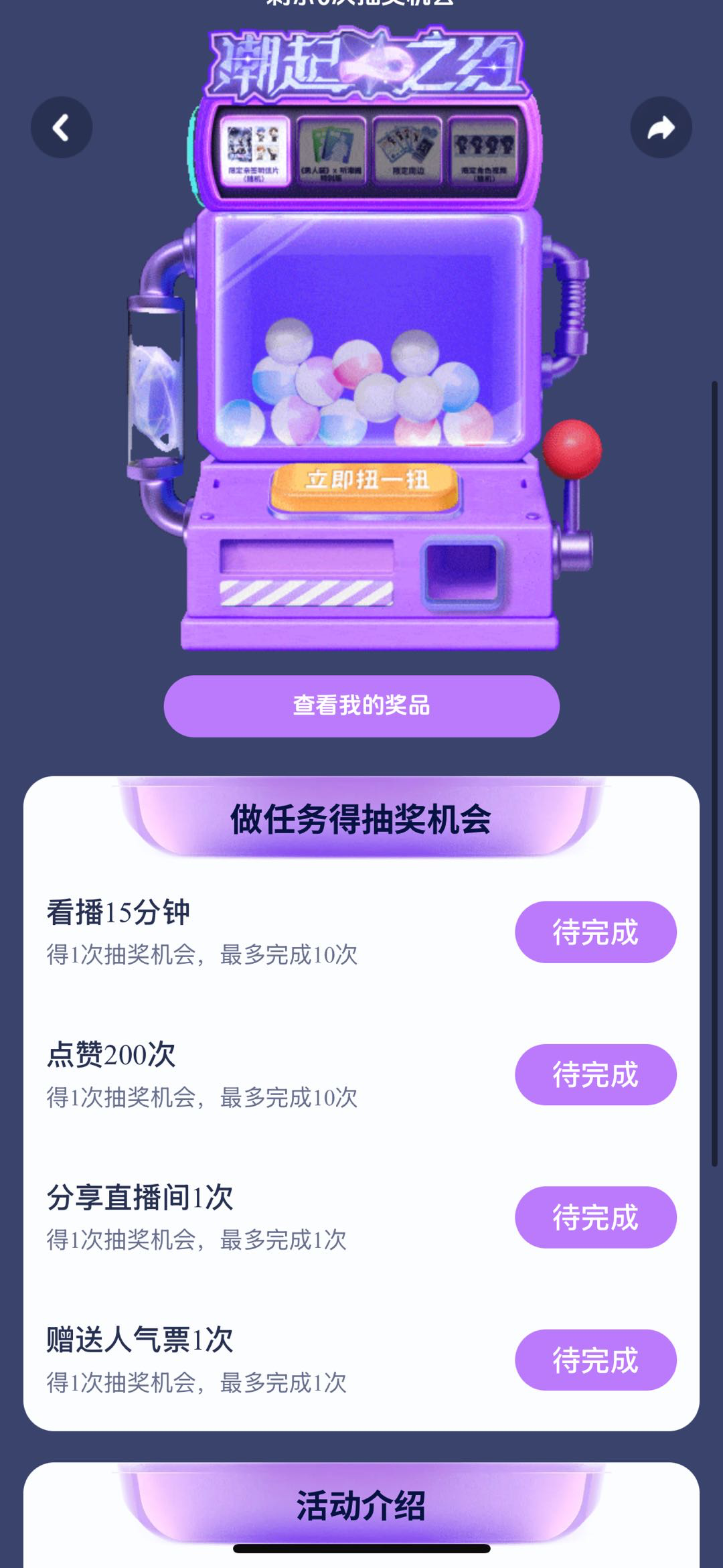 去年聽潮閣的《潮起之約》“虛擬音樂秀”里,就不光是主播的舞臺(tái)秀,觀眾通過觀看直播、點(diǎn)贊等活躍任務(wù)后,還能夠通過“扭蛋機(jī)”抽主播周邊,任務(wù)設(shè)定直接帶動(dòng)了直播間的停留時(shí)長和互動(dòng)密度。