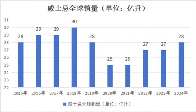 以烈酒最大品類威士忌為例,十年來,銷量始終在28億升水平徘徊,疫情后始終在艱苦爬坡。