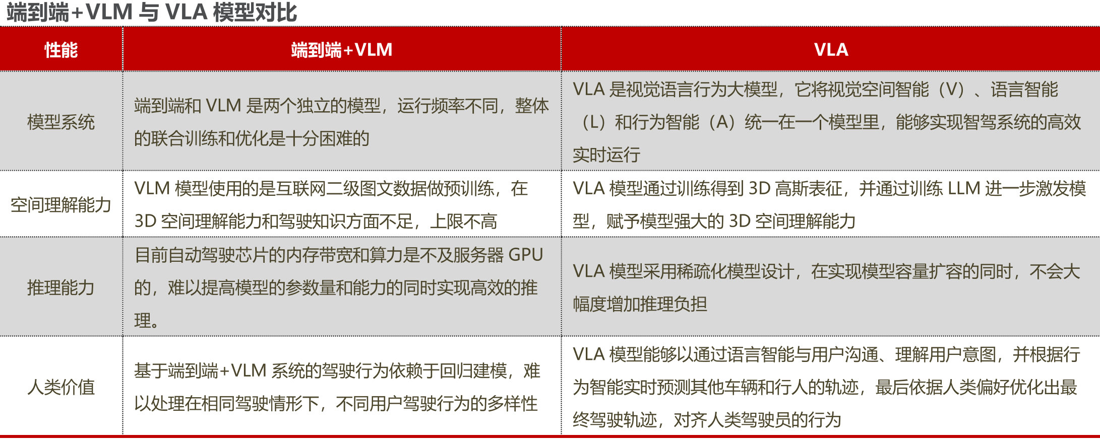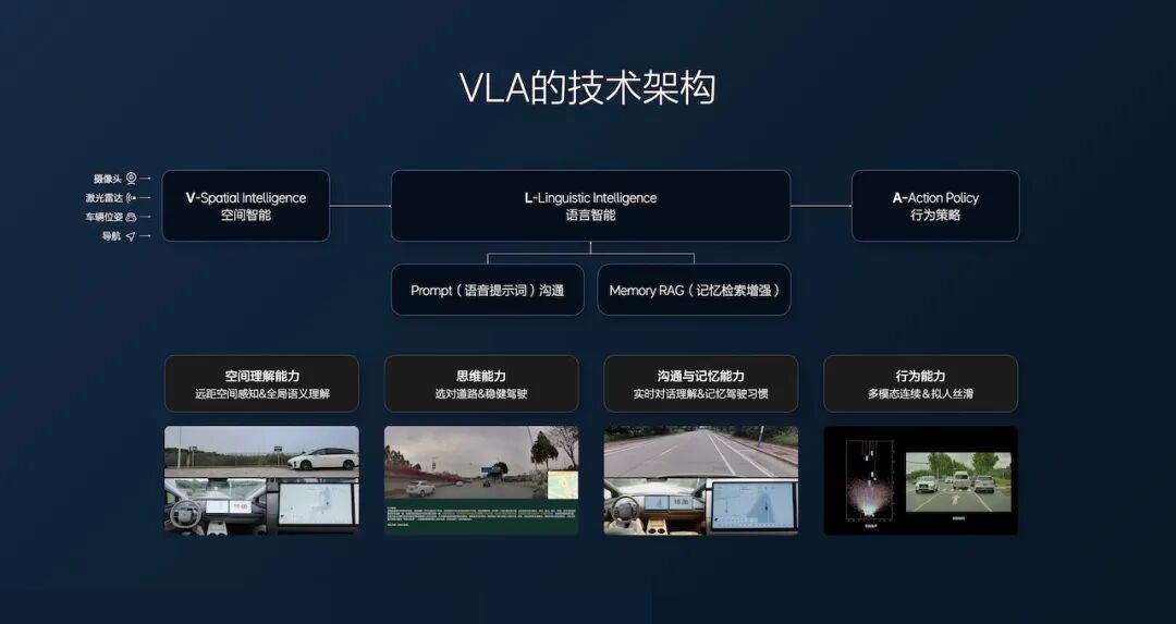 而VLA通過統(tǒng)一的大模型架構(gòu),將感知、決策、執(zhí)行無縫串聯(lián),形成“圖像輸入-語義理解-類人決策-動(dòng)作輸出”的閉環(huán),可以同步提高智駕的上限和下限,實(shí)現(xiàn)空間、行為和語言的統(tǒng)一。