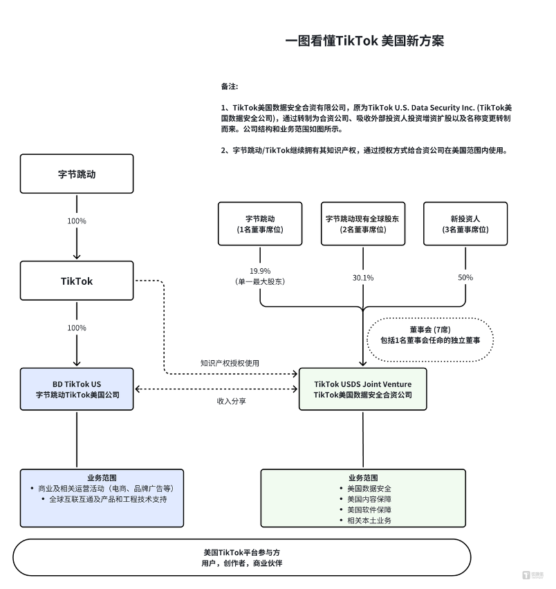 此前,TikTok未來(lái)在美國(guó)運(yùn)營(yíng)主要涉及兩個(gè)主體。上圖左側(cè)的“字節(jié)跳動(dòng)TikTok美國(guó)公司”,將負(fù)責(zé)電商、品牌廣告等商業(yè)活動(dòng),以及全球互聯(lián)互通等。該主體由字節(jié)跳動(dòng)100%全資持有。