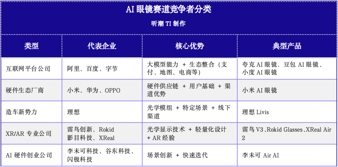 當(dāng)前市面上的AI眼鏡品類繁多,定價(jià)跨度極大,從數(shù)百元到數(shù)千元不等,主要的原因也正是在于產(chǎn)品形態(tài)的差異化定位。而在這場(chǎng)混戰(zhàn)中,并非所有玩家都站在同一起跑線。目前國(guó)內(nèi)可清晰劃分為以下五類競(jìng)爭(zhēng)者: