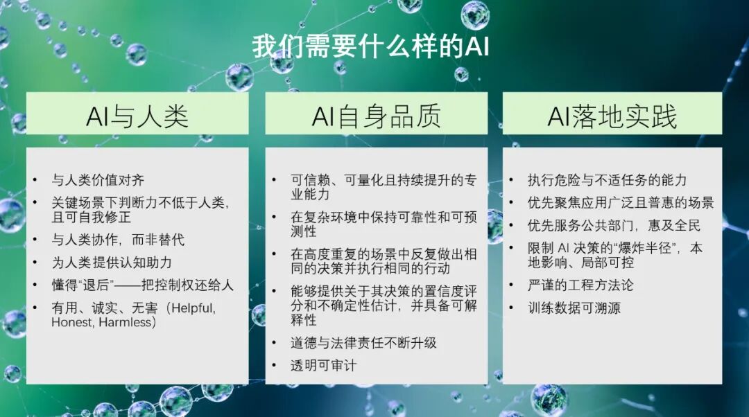 然后,Robert B. Fisher教授花了更多的篇幅來(lái)明確:我們真正需要的 AI 是什么樣的,按照“ AI 與人類的關(guān)系”、“ AI 的自身品質(zhì)”和“ AI 落地實(shí)踐”這三個(gè)角度,Robert B. Fisher教授為我們列出了“AI 的18項(xiàng)正面清單”: