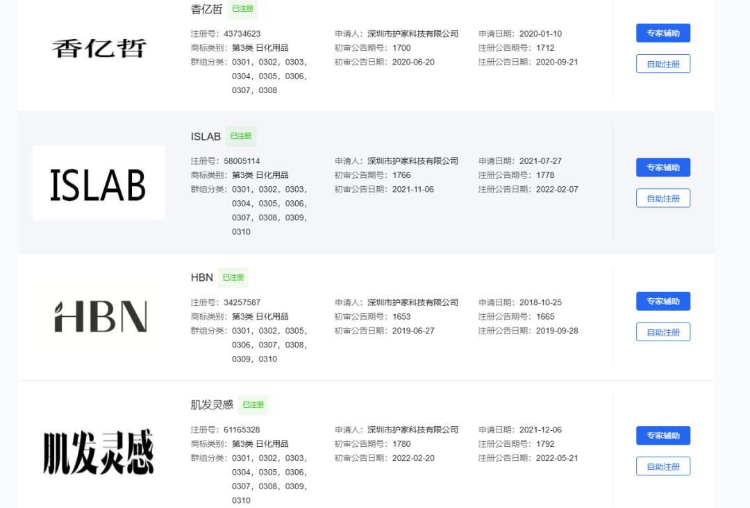 在一眾布局中,HBN母公司的動(dòng)向尤為值得注意。2025年,HBN母公司深圳市護(hù)家科技有限公司通過(guò)全資子公司杭州洛可馨生物科技,推出首個(gè)全新護(hù)膚品牌洛可馨LOCKSKIN。而據(jù)查詢,深圳市護(hù)家科技已悄然注冊(cè)了香藝哲、肌發(fā)靈感、HBN MEN等近20個(gè)商標(biāo),也就是說(shuō),其下一步或在香水、頭發(fā)護(hù)理、男士護(hù)膚等領(lǐng)域孵化全新品牌,足見其在品牌矩陣上的自信與野心。