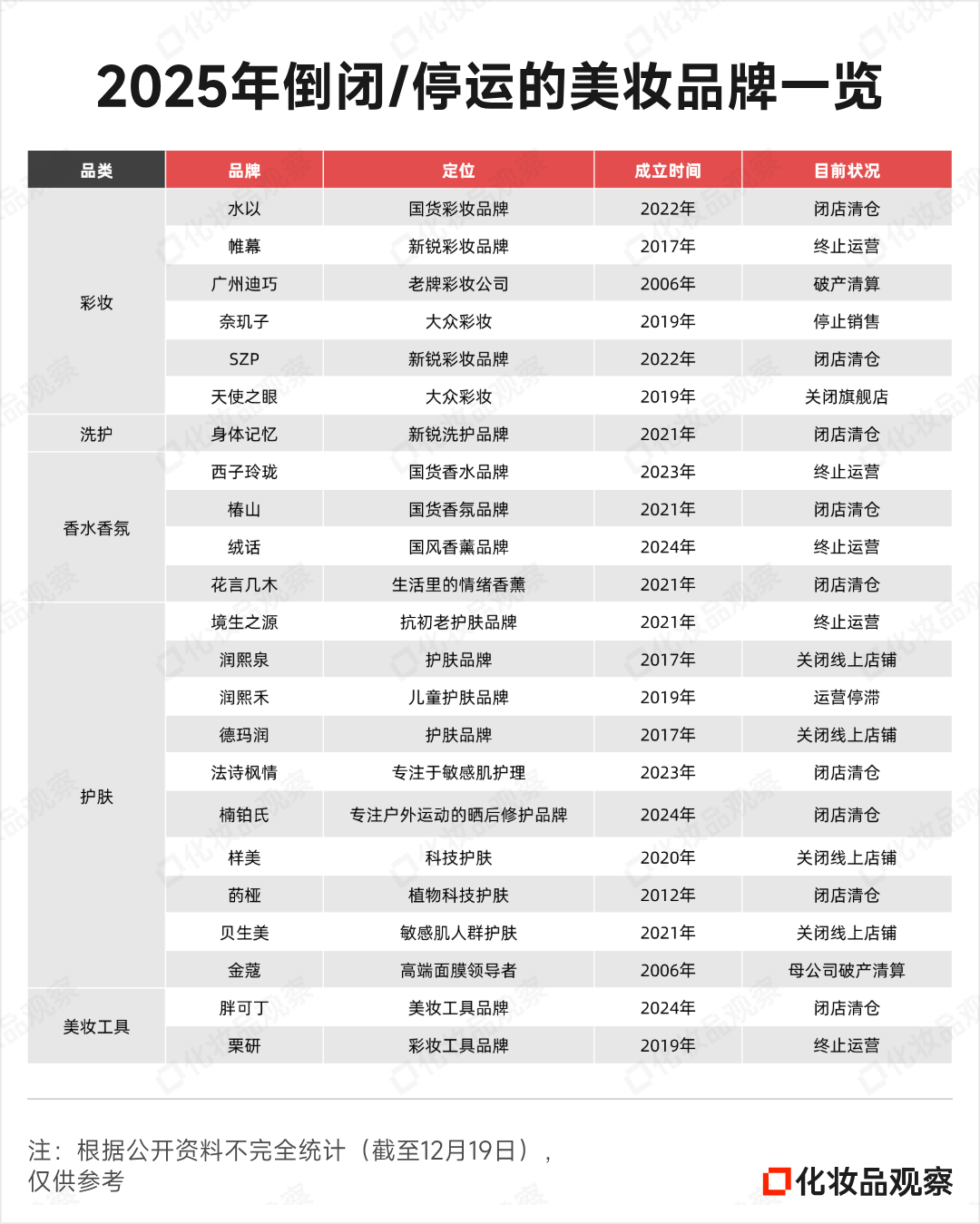 2025年的倒閉名單中,既有老牌彩妝廣州迪巧、高端面膜領(lǐng)導(dǎo)者金蔻這樣成立近20年的老品牌,也有絨話、楠鉑氏、胖可丁等成立僅一年的新銳。