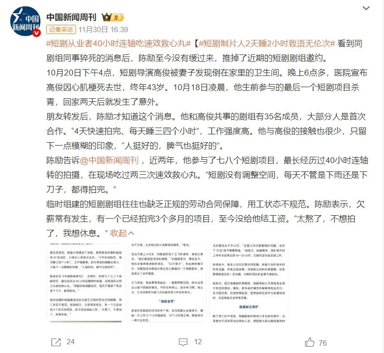 類似的事件,在短劇行業(yè)已不是第一次發(fā)生:短劇女王徐藝真曾表示自己每天工作18~20個小時,演員鄧友在社交平臺上透露僅他認識的人中,過去一年就有5人因短劇的高強度工作而猝死。而直到高俊導演的突然猝死引起了較大關(guān)注,外界才得以窺探到這些殘酷的真實。