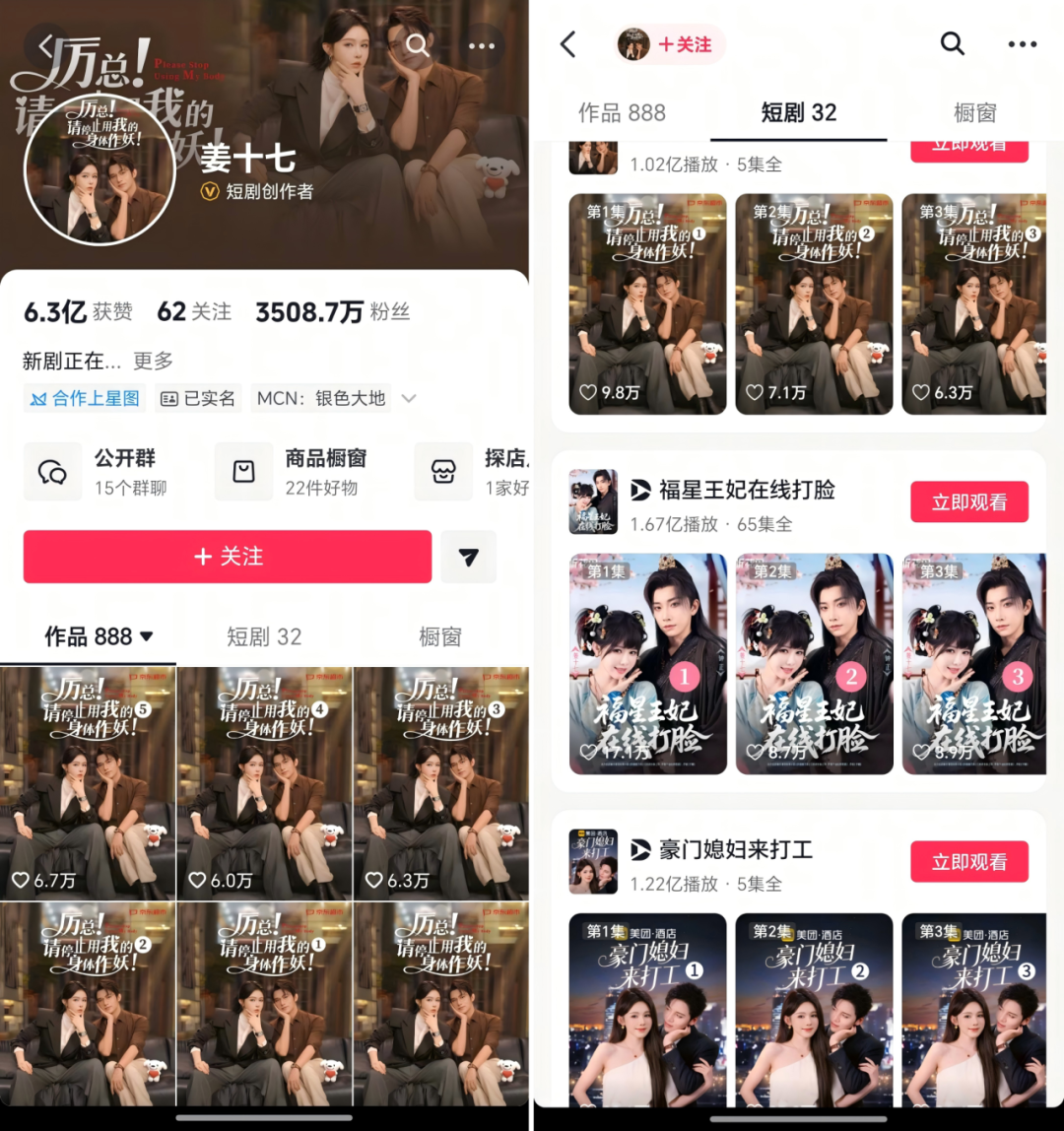 時機對于演員的重要性不言而喻,如今要盤點短劇女演員,不管從粉絲量、作品數(shù)量、爆款作品等幾個指標看最紅火的都是出最早的那批。比如憑借《惡女的告白》一炮而紅的姜十七,2019年就以劇情博主的身份活躍在抖音,如今已經(jīng)積累了3500多萬粉絲,去年她有6部短劇進入年度播放前十,在短劇界斷層第一。
