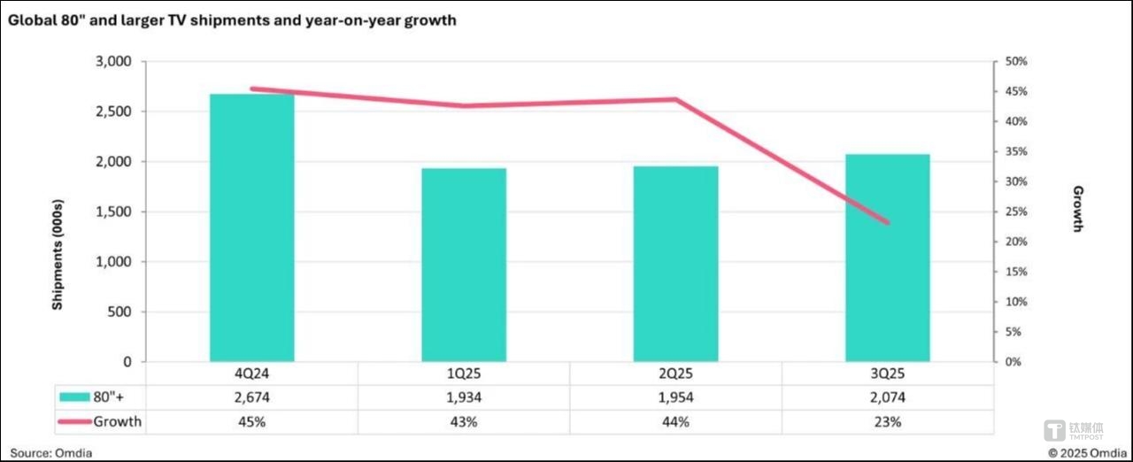 而中國市場的下滑也間接影響了全球市場的走勢,數(shù)據(jù)顯示,三季度全球電視機(jī)出貨量同比小幅下降至5250萬臺(tái)。中國市場的放緩也影響了80英寸及以上超大尺寸電視的增長速度,增速從過去的40%驟降至僅23.1%。在市場大盤衰退的背景下,洛圖科技(RUNTO)也下修了2025年全年泛百寸電視的出貨量至76萬臺(tái),Mini LED電視的預(yù)測銷量從年初的千萬臺(tái)下調(diào)至802萬臺(tái)。