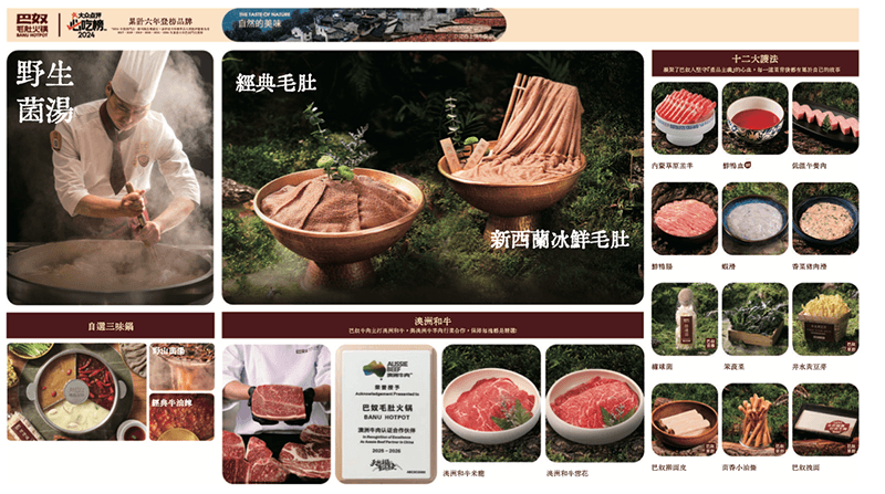 “毛肚+菌湯”是巴奴的招牌組合。據(jù)其介紹,毛肚采用更健康的木瓜蛋白酶技術(shù)發(fā)制,甚至遠(yuǎn)赴新西蘭牧場(chǎng)獲取優(yōu)質(zhì)食材;菌湯則嚴(yán)選云貴高原野山菌,堅(jiān)持門店每日現(xiàn)熬,4個(gè)小時(shí)用不完就倒掉。