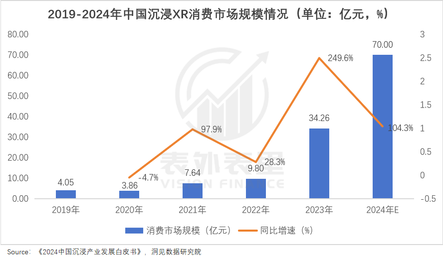 “整個(gè)行業(yè)熱火朝天。”他親眼見到VR體驗(yàn)館,從平均每座城市兩三家,進(jìn)化到每個(gè)商圈兩三家。數(shù)據(jù)也顯示,國內(nèi)沉浸XR消費(fèi)市場(chǎng)規(guī)模在2023-2024年翻倍增長,達(dá)到70億小高峰。