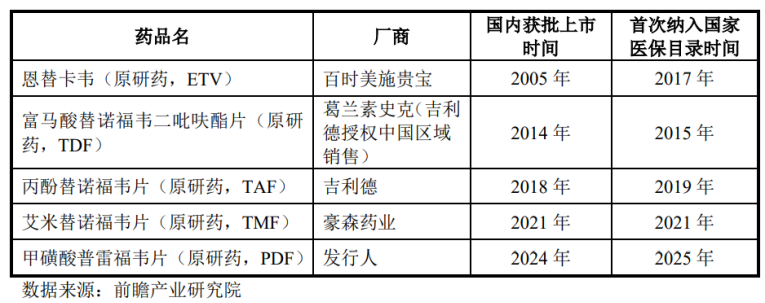 競(jìng)爭(zhēng)格局方面,截至2025年6月30日,國(guó)內(nèi)共有5款一線核苷(酸)類藥物獲批上市銷售,包括百時(shí)美施貴寶的恩替卡韋(原研藥,ETV)、葛蘭素史克(吉利德授權(quán)中國(guó)區(qū)域銷售)的富馬酸替諾福韋二吡呋酯片(原研藥,TDF)、吉利德的丙酚替諾福韋片(原研藥,TAF)、豪森藥業(yè)的艾米替諾福韋片(原研藥,TMF)、新通藥物的甲磺酸普雷福韋片(原研藥,PDF)。對(duì)比來(lái)看,新通藥物的產(chǎn)品最晚上市,正在面臨更大的競(jìng)爭(zhēng)壓力。