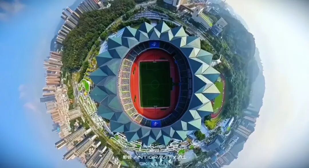 有的博主操縱著全景無人機,從武漢的鑰匙大樓中間飛過,視覺扭曲的建筑物讓人眼暈;還有人讓無人機飛過體育館上方,類似魚眼的地球影像中,一朵鮮花似乎正在綻放。