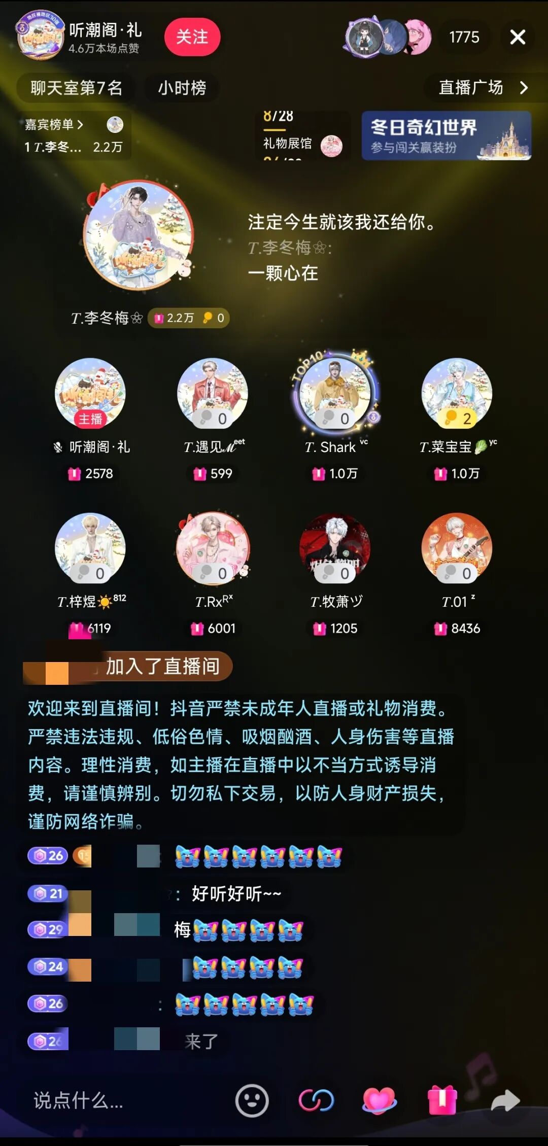 粉絲對主播的感情也反映在每個刷禮物的動作中。例如主播們在每檔直播開始時要扣排上麥,即每個歌手在任務(wù)群內(nèi)給自己定任務(wù)指標(biāo),如1.0、2.0、3.0等,所謂1.0就是1000音浪,相當(dāng)于100元,以此類推,全麥任務(wù)則是50.0以上,排名頭部主播可以上麥。任務(wù)指標(biāo)相當(dāng)于主播給自己定的軍令狀,如果任務(wù)不過則會被罰款。聽潮閣包含主題檔、常規(guī)檔、游戲檔、活動檔等,活動檔任務(wù)高時可達(dá)到1000.0。對粉絲來說,不讓自家主播受罰成為其刷票的重要動力,單場刷數(shù)萬元禮物的并不少見。