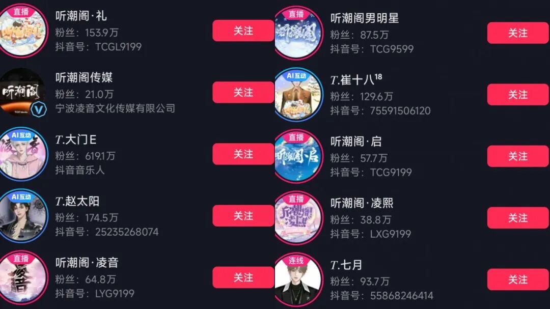 以聽潮閣和造夢師為例,前者創(chuàng)建于2022年9月,近3年多時間,全網(wǎng)粉絲便已超過1.5億。目前聽潮閣在抖音平臺有七個男廳賬號,其中,聽潮閣·禮粉絲為153萬,其余也都在幾十萬量級,并出現(xiàn)T.趙太陽、T.崔十八等超百萬粉絲的個人主播。而造夢師則成立于2023年,其旗下最火的頂流社語音廳,在抖音平臺粉絲數(shù)已超百萬。